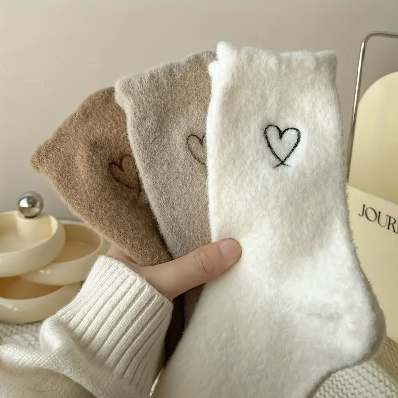 6 Pairs Heart Embroidery Socks, Comfy & Warm Fuzzy Socks, Women's Stockings & Hosiery